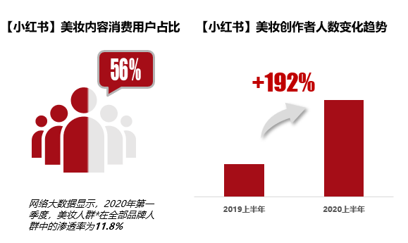作為小紅書長期以來最具優(yōu)勢的品類,美妝內(nèi)容消費量繼續(xù)在小紅書保持著快速增長。目前小紅書月度活躍人數(shù)過億,而在2020年6月,有56%的活躍用戶消費過美妝內(nèi)容;2020年上半年小紅書美妝類創(chuàng)作者同比增長192%,美妝整體筆記發(fā)布量同比增長108%,尤其值得注意的是,美妝視頻內(nèi)容播放量增長達113%,這為品牌在小紅書成長提供了豐富的流量支撐。