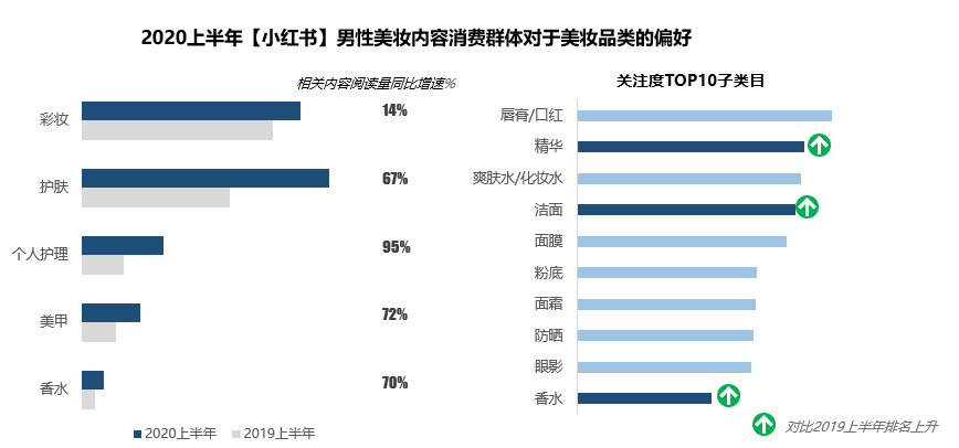 從性別來看,小紅書上男性對美妝內(nèi)容的消費量同比增長46%,25歲左右、在一線和新一線城市的男性是美妝人群主力軍。從對內(nèi)容的偏好來說,男性的偏好以護膚為主,今年上半年對護膚的關注漲幅達67%,而個人護理增速更加明顯。一些男士護膚品牌如雅詩蘭黛集團的LAB SERIES等也更加關注在小紅書的運營。