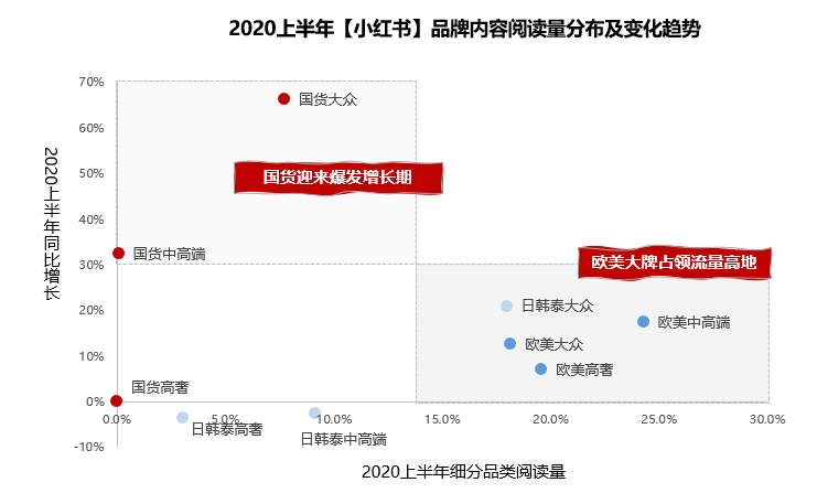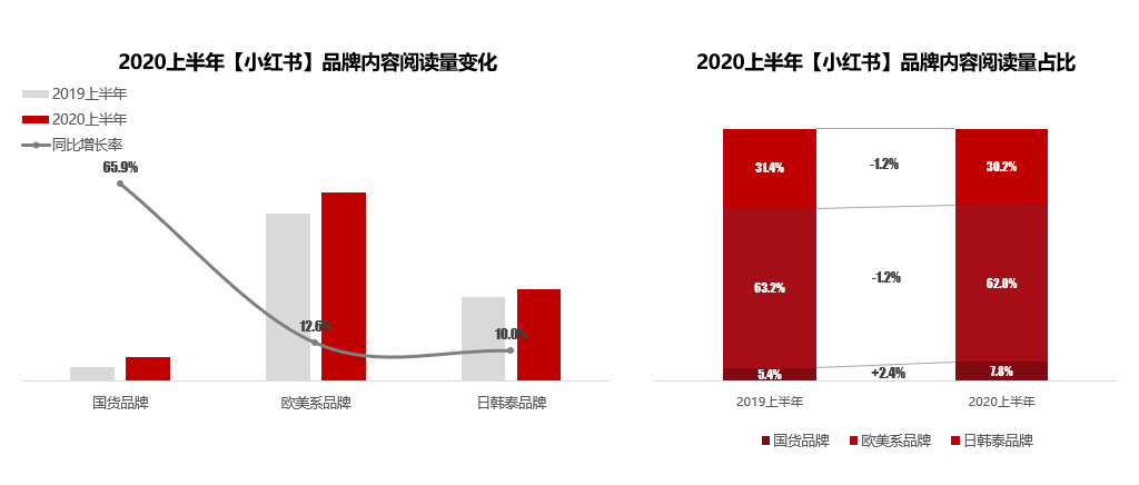 數(shù)據(jù)顯示,在2020年上半年小紅書平臺上國貨品牌內(nèi)容消費量同比大幅增長65.9%,遠超歐美系品牌和日韓泰品牌。從內(nèi)容總量占比來說,歐美系品牌依然占據(jù)絕對優(yōu)勢,但國貨品牌內(nèi)容消費量占比增加明顯。