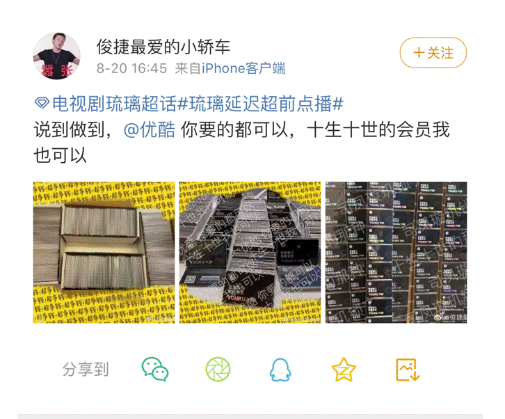 速途網(wǎng)8月20日消息(報(bào)道:李楠)今日,網(wǎng)友“俊捷最愛的小轎車”兌現(xiàn)承諾,在微博上曬出1000張優(yōu)酷會(huì)員卡。據(jù)稱此舉是為了感謝優(yōu)酷延遲《琉璃》的點(diǎn)播。