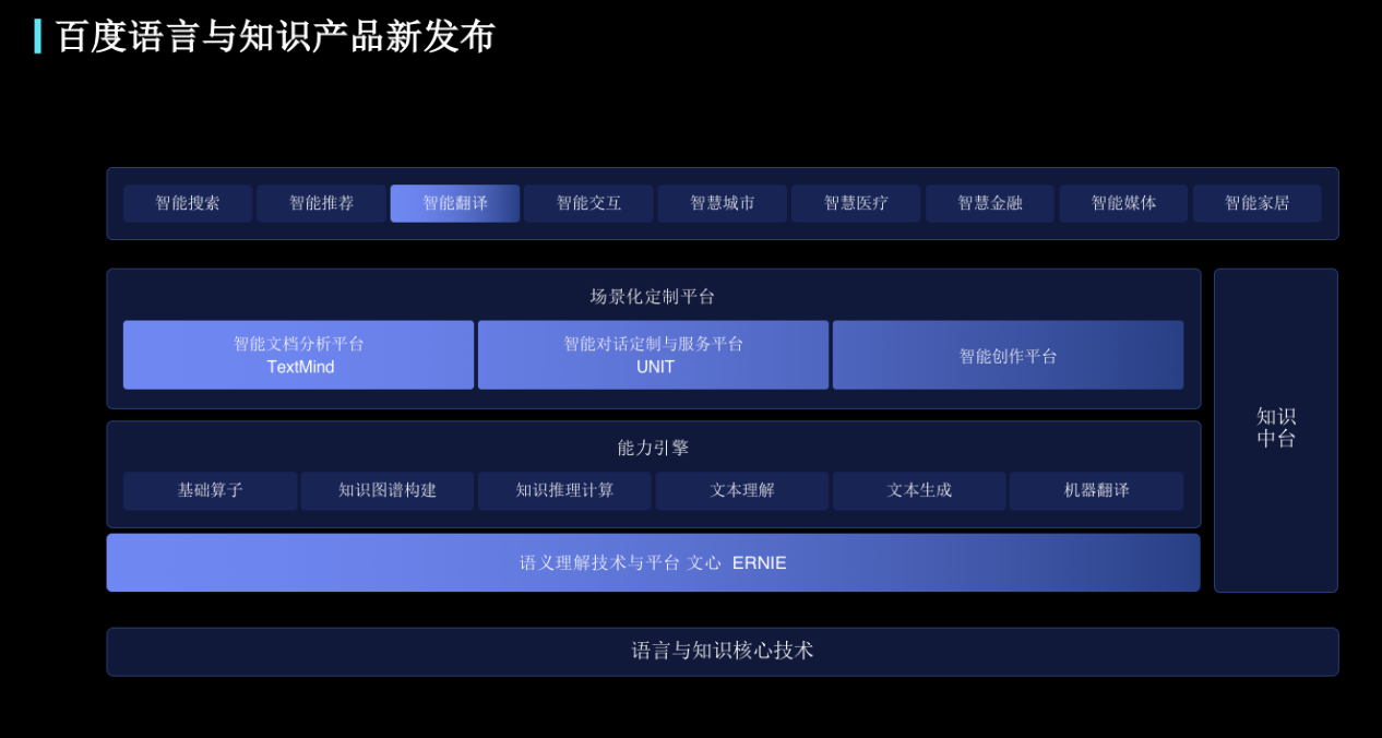 王海峰首次發(fā)布了百度大腦語言與知識產(chǎn)品全景圖。百度集團(tuán)副總裁吳甜接續(xù)發(fā)布語義理解技術(shù)與平臺文心、智能文檔分析平臺TextMind和AI同傳會議解決方案3大新產(chǎn)品,同時發(fā)布了6項升級,包括智能創(chuàng)作平臺的3個場景方案、以及智能對話定制與服務(wù)平臺UNIT的3項全新升級。