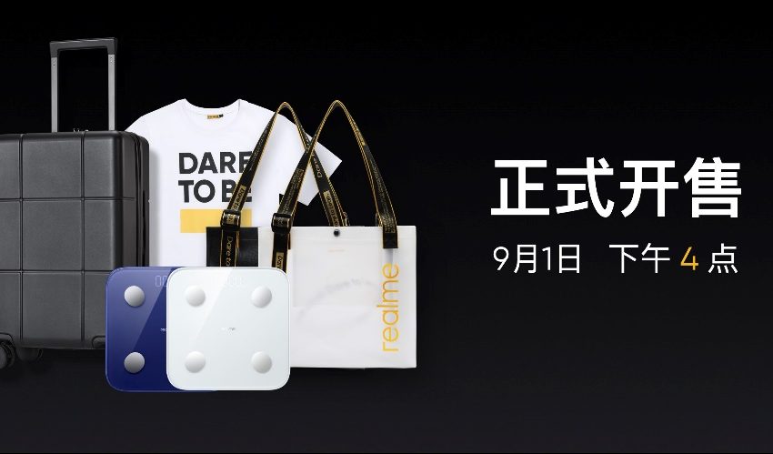 ?此次發(fā)布會上,realme帶來了五款潮玩新品:體脂秤、托特包、旅行箱、及紀(jì)念版T恤衫。