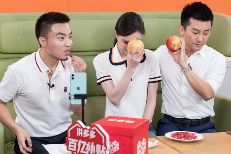 ▲9月1日,在拼多多百億補貼直播間里,奧運跳水冠軍吳敏霞(中)、張效誠(右)夫婦在推薦四川會理石榴,吳敏霞拿著大個的軟籽石榴跟自己的小臉比大小。(穆功/攝)