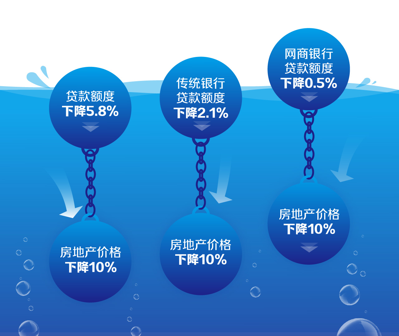 此次BIS發表工作論文,在研究對比了傳統銀行抵押貸、傳統銀行信用貸和網商銀行小微企業信用貸款后發現,房價下降10%,傳統銀行抵押貸額度下降5.8%,傳統銀行信用貸額度下降2.1%,而采用大數據風控為基礎的網商銀行小微信用貸款額度降幅最小,僅為0.5%,幾乎不受影響。