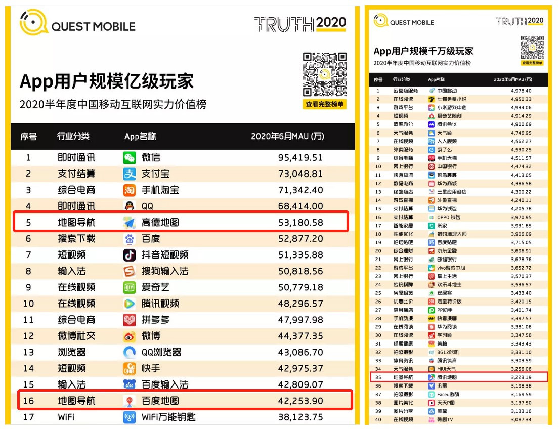 此外,據(jù)QusetMobile2020半年度中國(guó)移動(dòng)互聯(lián)網(wǎng)實(shí)力價(jià)值榜顯示,高德地圖與百度地圖在2020年6月位列億級(jí)玩家榜,兩者的月活躍用戶(MAU)分別為5.3億以及4.2億,而騰訊地圖位列用戶規(guī)模千萬(wàn)級(jí)玩家榜,月活躍用戶為3223.19萬(wàn)。