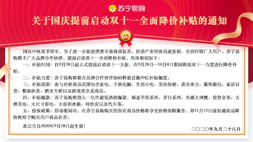 9月28日晚,蘇寧易購發(fā)布重磅消息稱,于9月28日提前正式啟動2020年雙十一大促,并將9月28日-10月8日的國慶雙節(jié)定為雙十一大促開啟,出臺50億補貼額度釋放、全品類補貼、投入一億件超低熱銷爆款、價保延長至11月12日等政策,提前打響補貼戰(zhàn)。