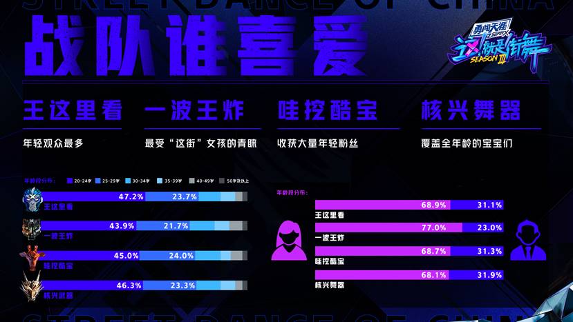 四大戰隊中,王嘉爾的“王這里看”年輕觀眾最多,王一博的“一波王炸”最受“這街女孩”青睞,鐘漢良的“哇挖酷寶”收獲了大量年輕粉絲,張藝興的“核興舞器”則覆蓋全年齡的觀眾。值得一提的是,有586位超級街舞迷連續71天觀看《街舞3》,每天“刷街”超過2.7小時。同時,今年也依舊有很多身在海外的觀眾通過歐美、東南亞等多個國家和地區的電視臺支持《街舞3》。