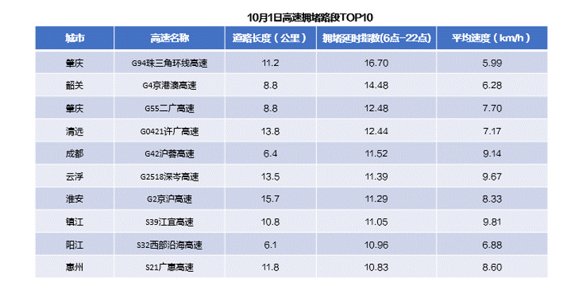 以十一當(dāng)天為例,排名前十的高速擁堵路段主要集中在廣東,其中G94珠三角環(huán)線高速肇慶段擁堵最為突出,6時至22時擁堵延時指數(shù)達16.70,平均車速僅為5.99千米/小時,其次是G4京港澳高速韶關(guān)段,G55二廣高速肇慶段排名第三。