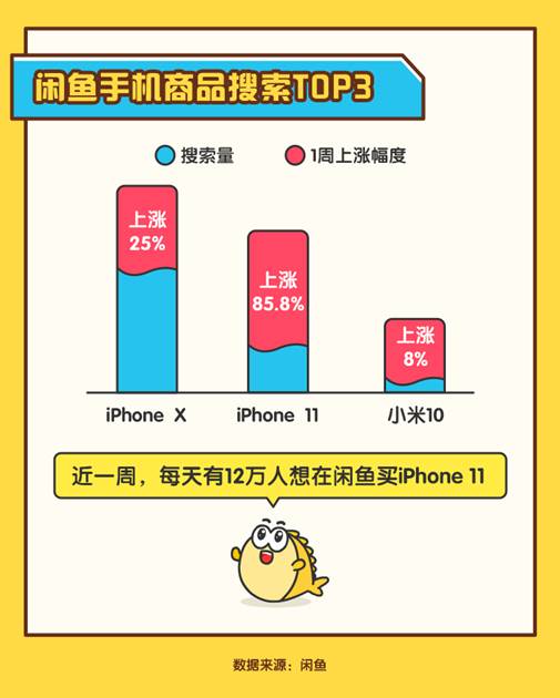 數(shù)據(jù)顯示:近兩周,平均每天有20萬用戶在閑魚為舊手機估價,換舊買新意愿強烈;與此同時,每天還有12萬人在閑魚搜索iPhone 11,靜待價格回落、“狩獵”之心溢于言表。