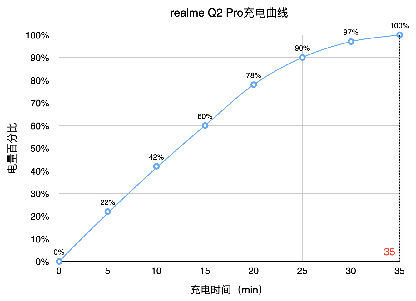 實測使用包裝內(nèi)的充電頭為realme 真我Q2 Pro充電,15分鐘便可充電60%,0-100%充電共耗時35分鐘。使用生活中的碎片化時間,便可以快速為手機補充電量。
