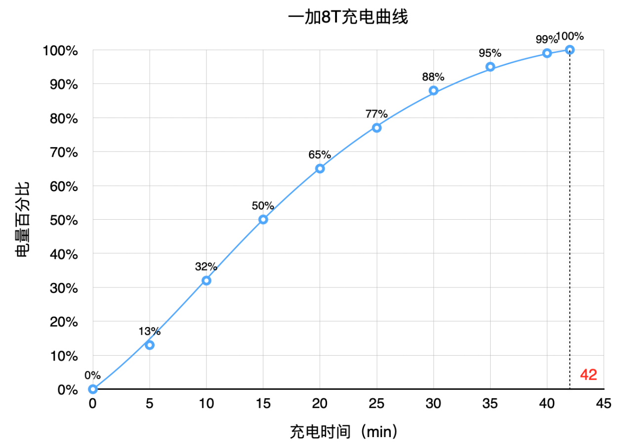實測采用官方充電器為一加8T充電,實測15分鐘即可充電50%,0-100%充電僅耗時42分鐘。
