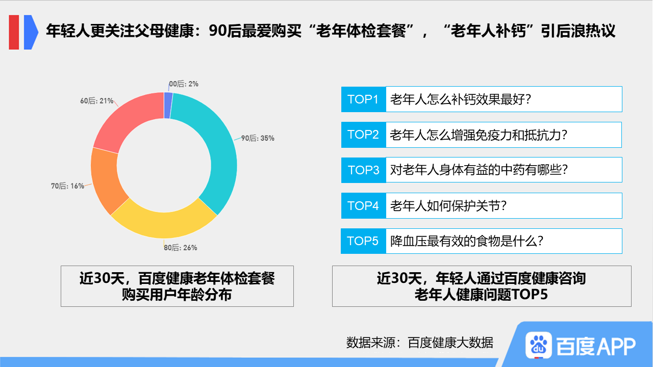 “憶得高堂臨別語(yǔ),授衣時(shí)節(jié)望還家。”兒女的陪伴是老人們最渴望的禮物,而父母的健康幸福是兒女最大的心愿。除了服裝、食品、保健品之外,專為老年人準(zhǔn)備的體檢套餐也成為了很多子女重陽(yáng)禮物的新選擇。百度健康大數(shù)據(jù)顯示,近30天,老年體檢套餐預(yù)約量同比上漲48%。在通過(guò)百度健康為老年人購(gòu)買(mǎi)體檢套餐的用戶中,90后人群位列第一,占比達(dá)到了35%。過(guò)了被照顧的年紀(jì),父母長(zhǎng)輩的身體問(wèn)題他們都記在心中 。在百度健康問(wèn)醫(yī)生平臺(tái)上,“老年人怎么補(bǔ)鈣效果最好”、“老年人怎么增強(qiáng)免疫力和抵抗力”成為年輕用戶關(guān)注的老年人健康重點(diǎn)問(wèn)題。