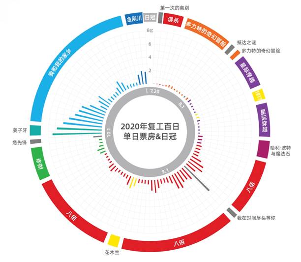 在復工前期,《八佰》和《我在時間盡頭等你》在一定程度上起到了“救市”作用:在兩部影片相繼上映的一周里,大盤單日票房開始接近去年同期水平,《八佰》的“日冠”天數,更是累計超過一個月的時間。