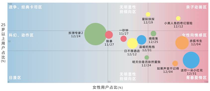 在即將到來的賀歲檔中,燈塔對多部定檔影片進行了受眾分析。在熱度排名前三的影片中,《拆彈專家2》的觀影人群明顯偏向于男性;另一邊,由易烊千璽主演的《一朵小紅花》最受25歲以下女性青睞,而由陳立農、李現主演的《赤狐書生》也呈現出明顯的女性受眾偏好。