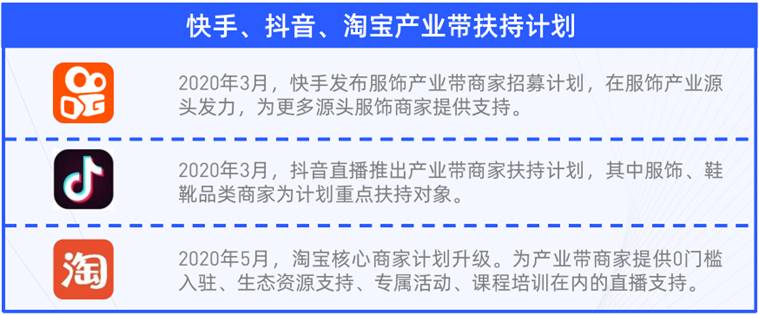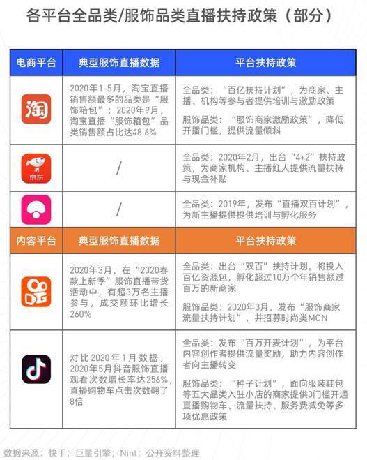 從典型平臺的直播電商扶持政策來看,全品類扶持政策成標配,更有部分平臺針對服飾品類出臺專項扶持,強化細分垂類影響力。