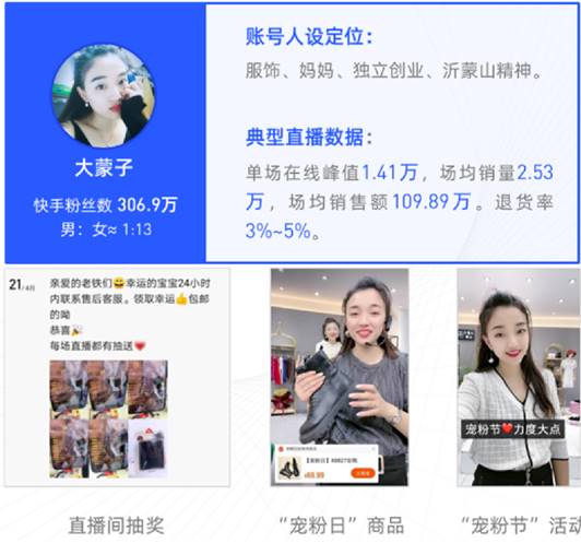報告中以快手主播“大蒙子”為例,深度剖析快手服飾直播生態(tài)。2018年中旬,“大蒙子”由線下批發(fā)轉型快手電商主播,以“服飾”、“媽媽”、“獨立創(chuàng)業(yè)”、“沂蒙山精神”為賬號定位,依靠著選品的物美價廉、產品宣傳的注重策略以及積極回饋粉絲,拉近老鐵關系。截至2020年9月14日,“大蒙子”已成長為粉絲300萬+的快手頭部服飾主播,單場在線峰值1.41萬,場均銷量2.53萬,場均銷售額109.89萬。