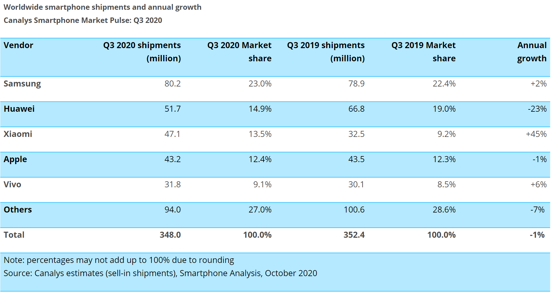 速途網10月30日訊(報道:喬志斌)今日,國際市場研究機構Canalys發布全球手機市場Q3季度跟蹤報告,數據顯示,2020年Q3,全球智能手機出貨量同比下降1%,但環比增長22%。頭部廠商中變化最大的是,小米出貨量位居全球第三。這是繼2014年之后,小米第二次進入全球前三,同比增長45%,是前四名中唯一逆勢大漲的手機廠商。