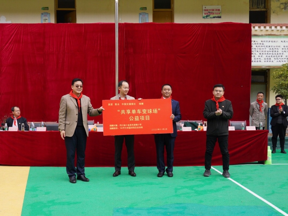 11月2日,美團交通政府事務部負責人孫可青、中國交通報社副社長莊長波等代表出席了新球場的捐贈儀式,為孩子們送出這份由共享單車輪胎“變身”的禮物。