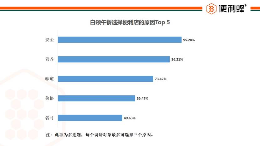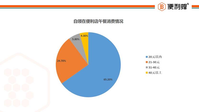 速途網11月5日消息(報道:李楠)經過兩個月的調研,便利蜂于近日發布《白領午餐報告》。數據顯示,65.2%的白領午餐消費在20元以內,95.28%的消費者最看重便利店午餐的“安全性”。