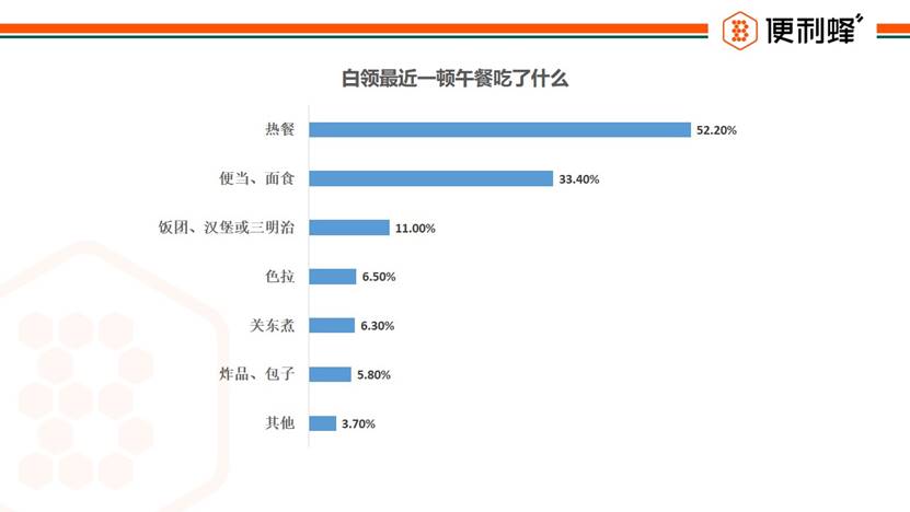 超五成白領最近一頓午餐吃了便利蜂的熱餐,超三成吃了便當、面食,另有11%的人選擇了飯團、漢堡和三明治等鮮食,就連炸品、包子和關東煮等早餐或宵夜類食品也出現在不少人的午餐清單里。