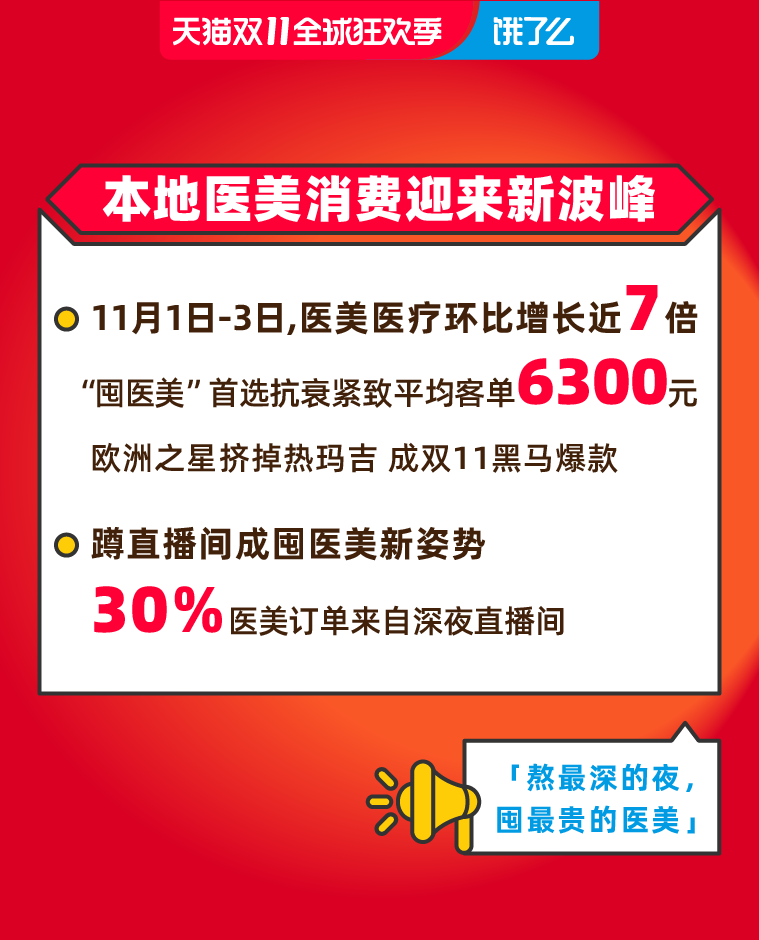 餓了么數據顯示,11月1日-3日,醫美醫療銷售較618增長近7倍。“抗衰緊致”成消費者“囤醫美”的最首要訴求。