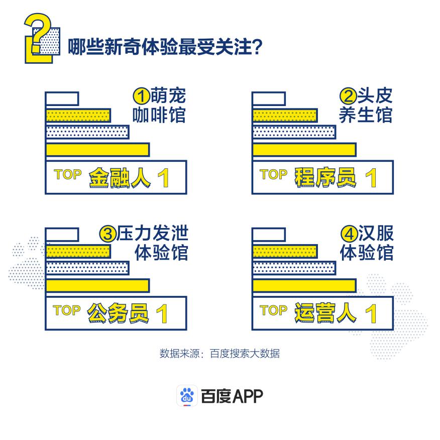 百度搜索大數(shù)據(jù)顯示,金融人對萌寵咖啡館這一新奇體驗充滿熱愛,程序員和公務員最愛的分別是頭皮養(yǎng)生館和壓力發(fā)泄體驗館,作為互聯(lián)網(wǎng)支柱角色的運營人,最喜愛的則是漢服體驗館。