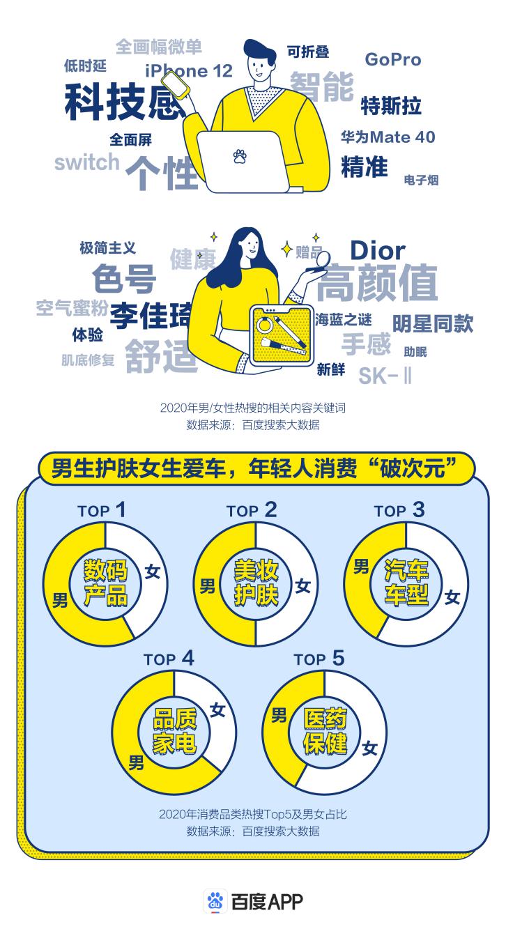 不斷追求新潮的年輕人,在進行消費時總有一些關(guān)鍵因素始終不變。百度搜索大數(shù)據(jù)顯示,科技感、手感、極簡主義、高顏值等內(nèi)容成為2020年熱搜的消費品高頻詞。數(shù)碼產(chǎn)品、美妝護膚、汽車車型等品類成為2020年消費品類的熱搜Top5。