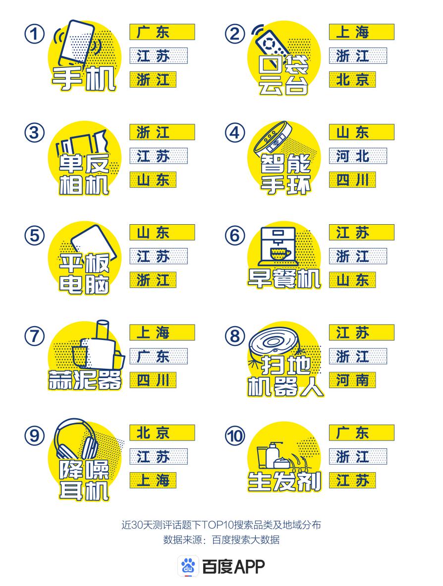 這屆年輕人不再盲從、迷信品牌,好用與否,都要自己探索。數(shù)據(jù)顯示,江浙滬的“測評青年”占比最大,他們更關(guān)心科技產(chǎn)品。百度搜索大數(shù)據(jù)顯示,手機、口袋云臺、單反相機等品類成為近30天測評話題下Top10。