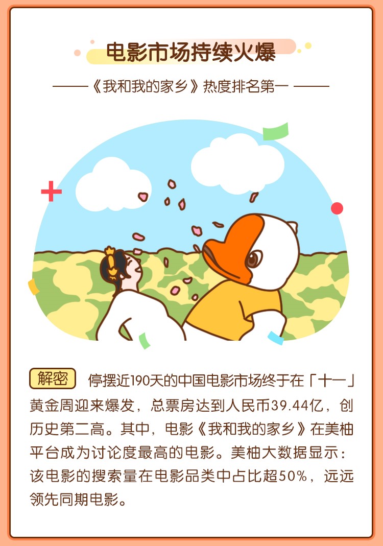 據美柚大數據顯示,婚禮相關搜索同比增長超40%,十一假期被愛情的甜蜜所包圍;國內游成為美柚用戶首選,上海討論熱度超50%,迪士尼等熱門景點更是人頭攢動;除此之外,電影市場也積攢了足夠多的優質影片,《我和我的家鄉》成美柚平臺用戶最愛,《姜子牙》《奪冠》等佳片也頗受關注。
