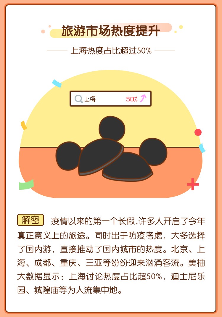 在美柚平臺上,上海討論熱度占比超50%,迪士尼樂園、外灘、城隍廟等熱門景點游客如織。北京、成都、重慶等國內城市也成為美柚用戶出游的熱門選擇。