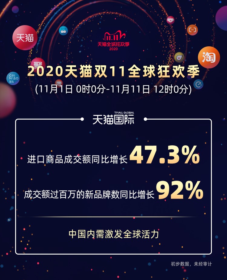 海外品牌迎來爆發(fā)增長。天貓雙11數據顯示,11月1日至11日中午12點,天貓國際進口商品成交額同比增長47.3%,其中180個海外品牌成交額過千萬,816個海外品牌成交額過百萬。