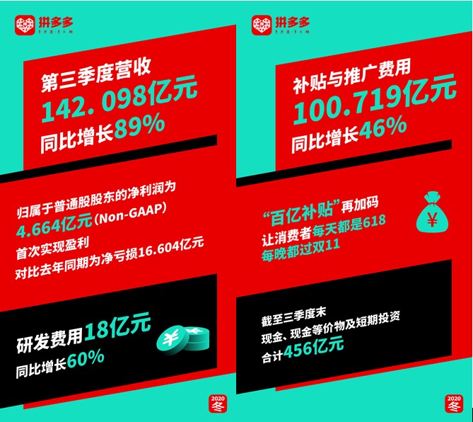 速途網11月17日訊(報道: 喬志斌)拼多多最新發布的2020年第三季度財報中,首度盈利無疑成為最大看點。財報顯示,三季度,拼多多實現營收142. 098億元,較去年同比增長89%;非美國通用會計準則(NON-GAAP)下,拼多多三季度歸屬于普通股股東的凈利潤為4.664億元。