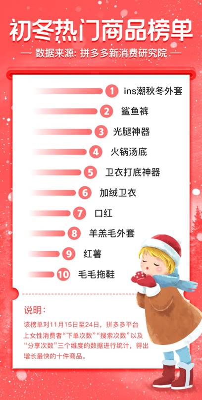 11月25日,新電商平臺拼多多發布《初冬女性消費熱門商品榜單》。該榜單對11月下旬以來,平臺女性消費者的購物行為進行統計分析,綜合了消費者搜索、分享及下單指數綜合排名后得出。