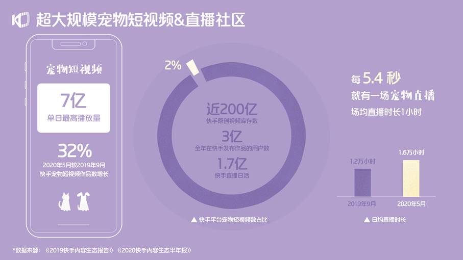 根據(jù)快手大數(shù)據(jù)研究院發(fā)布《2020快手寵物生態(tài)報告》,截止到2020年5月,快手活躍寵物作者已經(jīng)達(dá)到了7.5萬,快手寵物觀眾超過1億,快手寵物短視頻單日最高播放量達(dá)7億,每5.4秒就有一場寵物直播。目前,快手圍繞寵物食品、寵物醫(yī)療、寵物電商等打造了快手寵物生態(tài),為品牌方、寵物達(dá)人及消費者帶來豐富多樣的內(nèi)容及產(chǎn)品,形成了快手寵物服務(wù)生態(tài)圈。