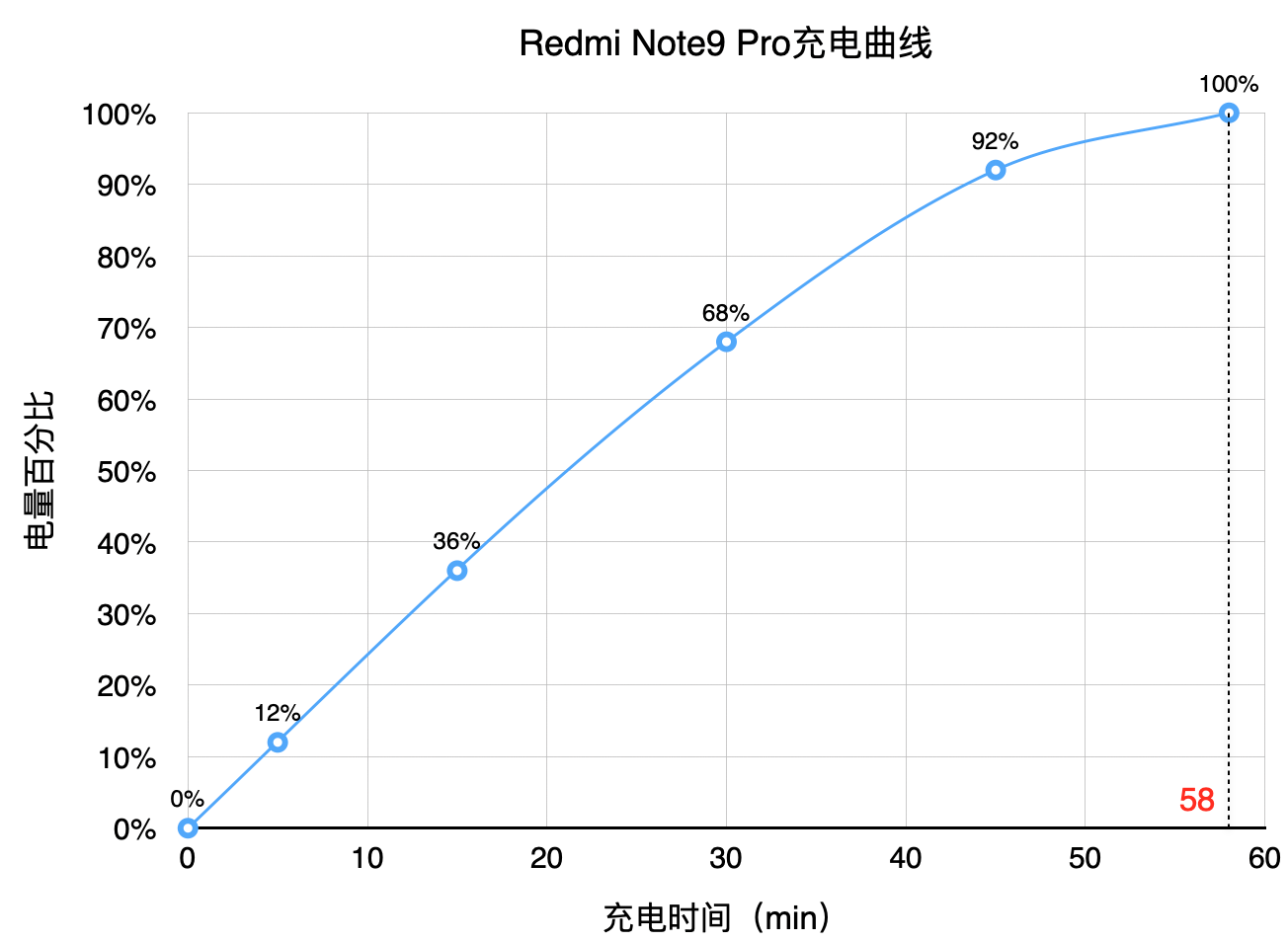 同時,Redmi Note9 Pro還配備了33W快充,雖然功率看上去并不高,但由于采用了內(nèi)阻更低的電池,也能在1小時內(nèi)快速補(bǔ)滿電量。在充電實(shí)測環(huán)節(jié),使用官方提供的充電頭為手機(jī)進(jìn)行充電,實(shí)測0-100%充電僅用時58分鐘。