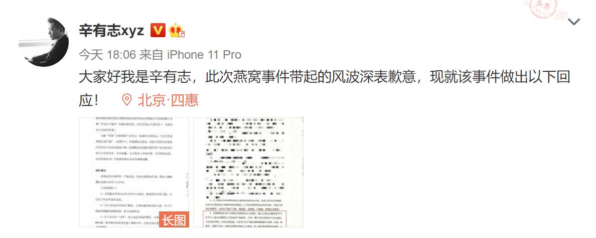 速途網11月27日訊(報道: 王璇) 針對所售燕窩被檢測為糖水一事,快手主播辛巴(本名辛有志)今晚在其微博上發出“辛有志寫給廣大網友的一封信”,信中承認在直播間推廣銷售的“茗摯”燕窩存在夸大宣傳,實為一款燕窩風味飲品,并對“燕窩事件”帶起的風波深表歉意。”并表示,對于售出的燕窩,將全部召回、承擔退一賠三責任。