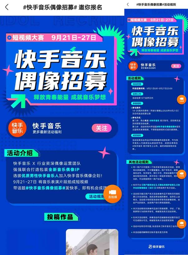 值得一提的是,為了從快手短視頻平臺中發掘出兼具偶像潛力和音樂才華的青年新秀,快手音樂團隊還在此前發起了#快手音樂偶像招募#站內活動,邀請快手平臺所有18至25歲音樂人帶話題分享自己的表演視頻,并由專業評審進行選拔,確定最后成團名單。