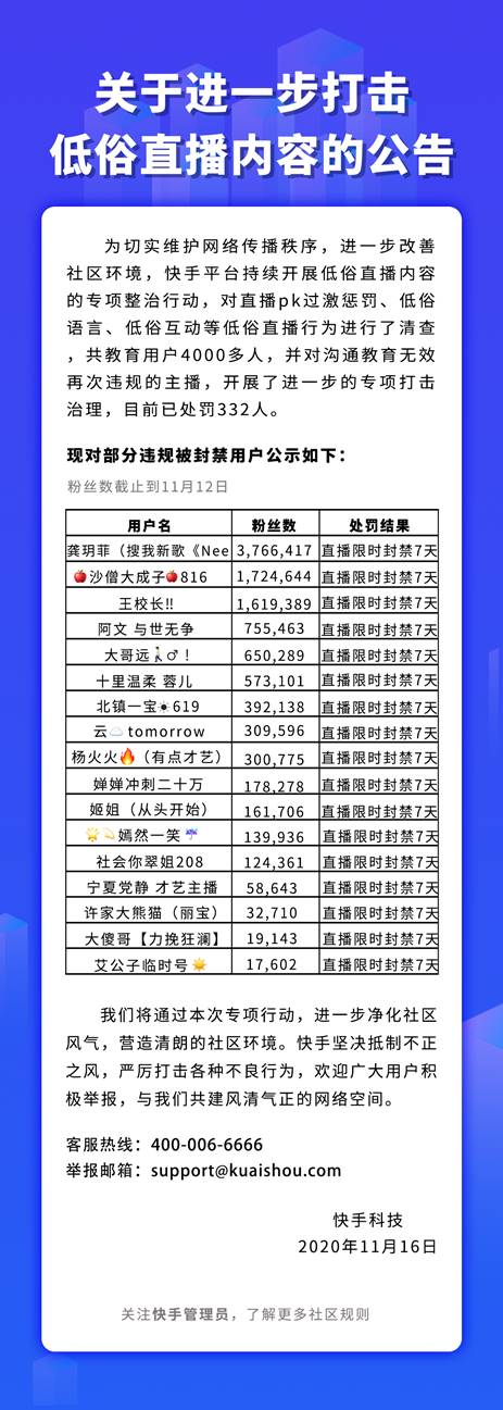 在7月14日發布的《關于打擊低俗直播內容的公告》中,公告的部分違規用戶中,18人中百萬粉絲量級的大V有11人。根據對快手在站內發布的針對低俗直播內容的整治公告統計,7月以來,快手共清查出低俗直播類賬號5000多個,其中經教育、限時直播封禁處罰改正的有4000多個。
