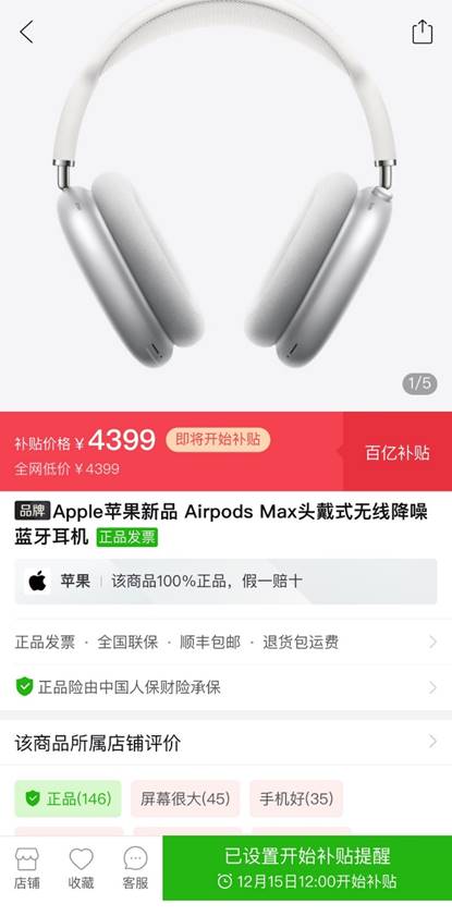 拼多多AirPods百億補(bǔ)貼負(fù)責(zé)人表示,參加百億補(bǔ)貼的AirPods Max本月20號(hào)即可發(fā)貨,網(wǎng)友們紛紛表示已經(jīng)設(shè)置好了“12月15日的補(bǔ)貼提醒”,希望在市場(chǎng)貨源不充裕的情況下?lián)尩绞装l(fā)新品。