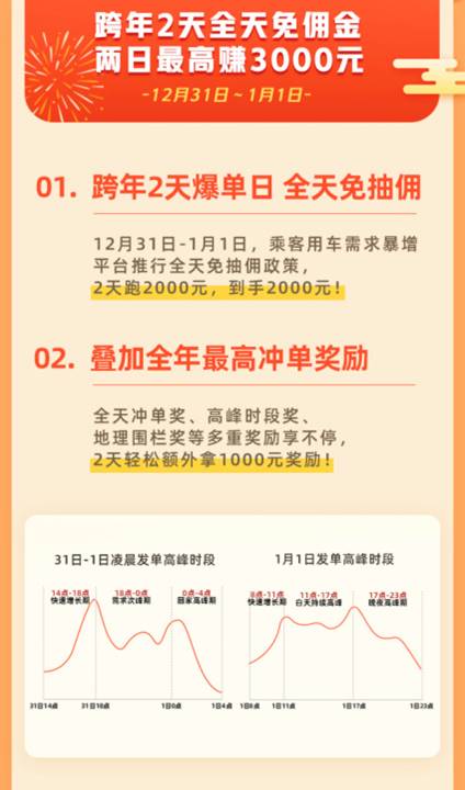 為了鼓勵司機師傅出車,多勞多得,努力讓乘客有車可打,高德打車聯合60余家出行合作伙伴再次推出“全天免傭金”活動,2020年12月31日和2021年1月1日兩天,為司機師傅全天免傭。高德打車還將推出全年最豐厚的司機獎勵,全天沖單獎、高峰時段獎、地理圍欄獎等多重獎勵并行,獎勵力度比日常翻倍。高德打車預測,跨年兩天,司機最高收入有望達到3000元。