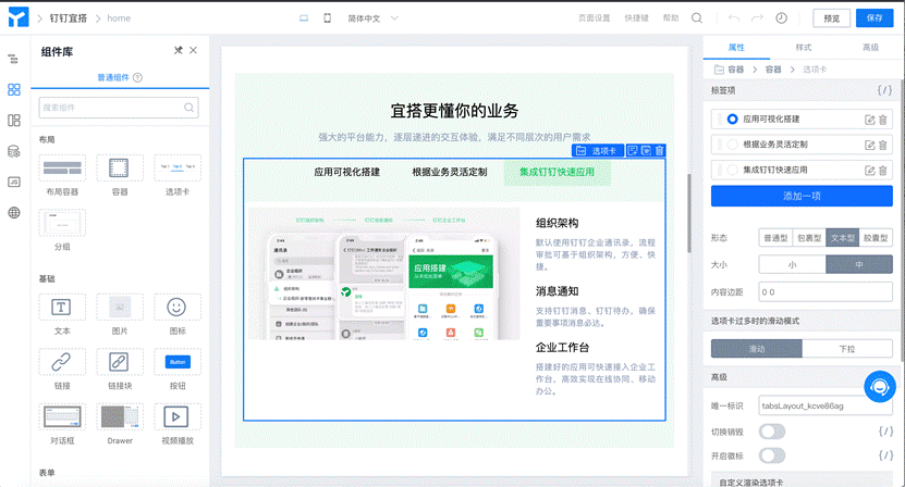 釘釘宜搭上提供了超過100項圖形化的開發(fā)組件,集合應用頁面編排、業(yè)務模型編排、業(yè)務流程編排、服務編排及數(shù)據(jù)展現(xiàn)與分析等五大核心能力,用戶“拖拉拽”開發(fā)組件,即可完成應用的搭建,不懂代碼的業(yè)務人員,如HR、財務也可成為開發(fā)者。