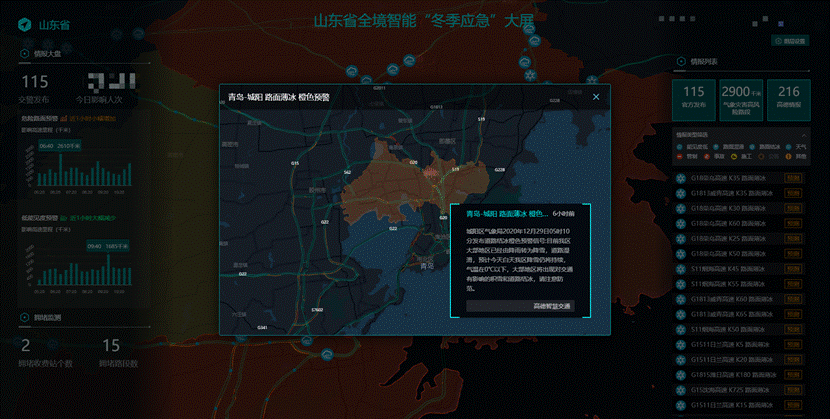 通過“全境智能冬季應急大屏”的危險天氣預警模塊,高速運營管理人員不僅可以實時監測轄區內受天氣影響的風險路段狀態,查詢6小時內的風險路段情況及能見度變化的歷史趨勢,還可通過該智能應急大屏了解未來2小時路面風險變化,將決策前置,提早預見可能出現的問題,提早做出防范,優化管理決策的結果和效率。同時,大屏的“情報大盤模塊”可以實時展現交管部門在轄區內施工、事故等事件信息的發布,對應的影響人次數量、實時掌握管制信息發布對公眾的幫助和影響覆蓋情況。