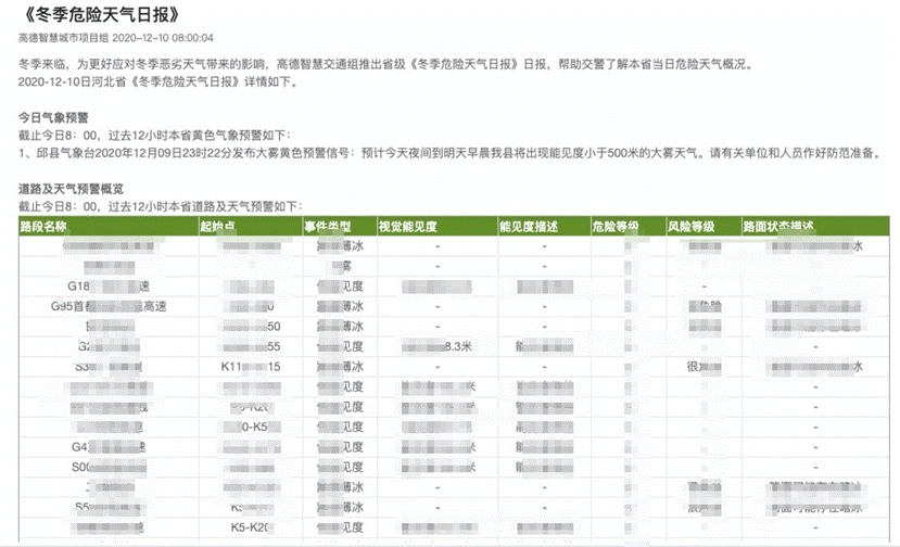 除此之外,高德地圖還為各地交警部門提供了《冬季危險天氣日報》,每天提供各省市天氣預警和氣象災害高風險路段,幫助交警了解當地的危險天氣情況,提前進行應對工作。