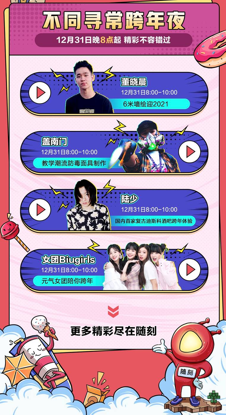 經過近一年的布局發展,隨刻已成為年輕人表達自我、分享熱愛、找尋同好的新陣地。31日晚8點,在“不同尋??缒暌埂敝辈ブ?,創作者董曉晨、蓋南山、 陸少、女團Biugirls等將分別帶來“6米墻繪迎2021”、“教學潮流防毒面具制作”、“國內首家復古迪斯科酒吧跨年體驗”、“元氣女團陪你跨年”等豐富內容。這些來自不同興趣圈子的創作者直播與互動,將最終為用戶、粉絲呈現出多場與眾不同的跨年狂歡夜。
