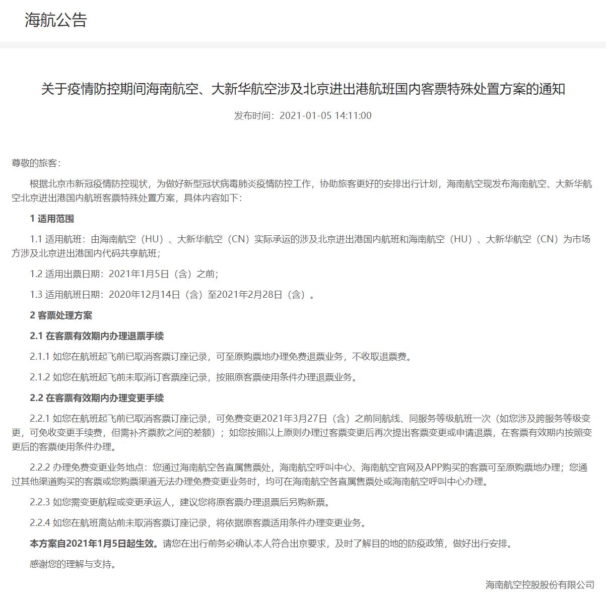 此外,海南航空現也發布了海南航空、大新華航空北京進出港國內航班客票特殊處置方案。凡是在2021年1月5日(含)之前,由海南航空(HU)、大新華航空(CN)實際承運的涉及北京進出港國內航班和海南航空(HU)、大新華航空(CN)為市場方涉及北京進出港國內代碼共享航班、旅行日期為2020年12月14日(含)至2021年2月28日(含)的客票,均可享受客票退改政策。