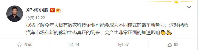 小鵬汽車創始人何小鵬,對于百度進入造車行業“新勢力”呈現積極態度,他認為科技企業成為造車新勢力對汽車市場和新的移動生態真正到來,會產生非常正面的加速影響。