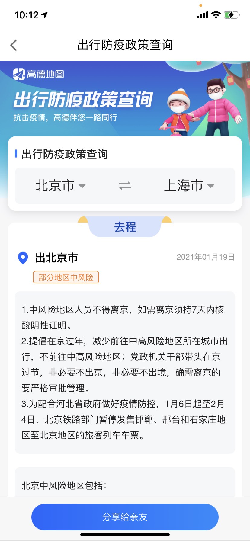 “能返鄉(xiāng)嗎?”“道路是否有管控?”“需要集中隔離嗎?”“要做核酸檢測嗎?”2021年春運(yùn)將至,計(jì)劃返鄉(xiāng)的人們也急需提前了解各地防控政策。為此,高德地圖同步上線了出行防疫政策查詢專題,用戶輸入任意起點(diǎn)、終點(diǎn)城市,均可實(shí)時查詢行程中的中、高風(fēng)險(xiǎn)地區(qū),并獲悉當(dāng)前進(jìn)城及離城的權(quán)威防疫政策,如是否需要核酸檢測證明、是否需要隔離等信息。