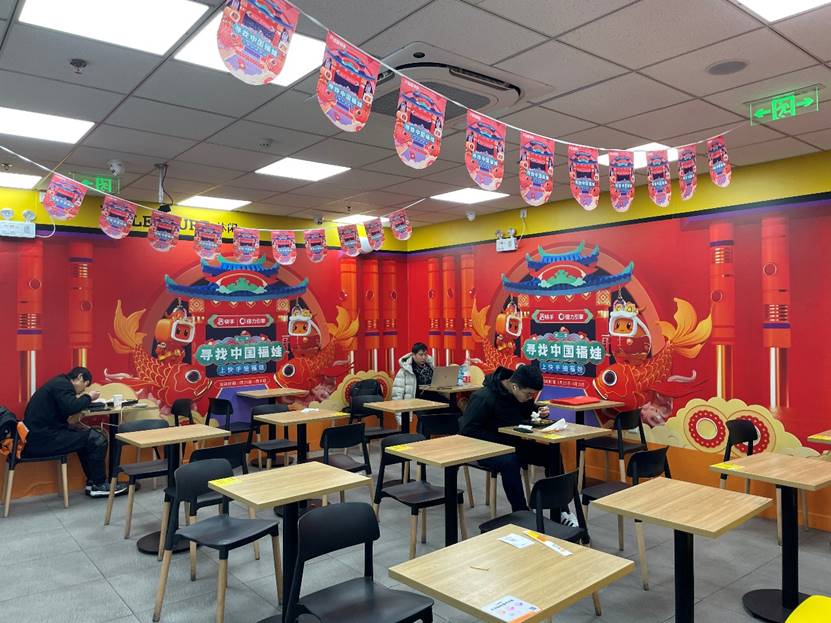 正是基于便利蜂的線下場(chǎng)景價(jià)值,快手將新春活動(dòng)落地在便利蜂門店內(nèi)。走在便利蜂主題店前,就能看到大門兩邊兩條紅色的鯉魚圖案,寓意“連年有余”。門店內(nèi)的墻紙壁畫、貨架、冰柜也覆蓋了喜慶的中國紅元素,主題為“尋找中國福娃”。