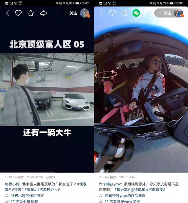 為了滿足汽車用戶對(duì)內(nèi)容的多樣化需求,快手也涌現(xiàn)了聚焦不同內(nèi)容方向的主播,比如高能創(chuàng)作者終極小騰、汽車特技yoyo、大可說車、老丈人說車、玩車報(bào)告。其中,終極小騰逛遍了國內(nèi)豪華酒店與富人區(qū)的地下停車庫,滿足了車迷們對(duì)于富人座駕的好奇心;汽車特技yoyo則有地表最強(qiáng)女司機(jī)之稱,跑出各種高難度汽車特技,讓觀眾大呼過癮。