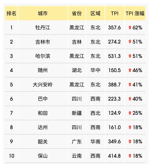 境內(nèi)城市TPI指數(shù)漲幅排行前10名